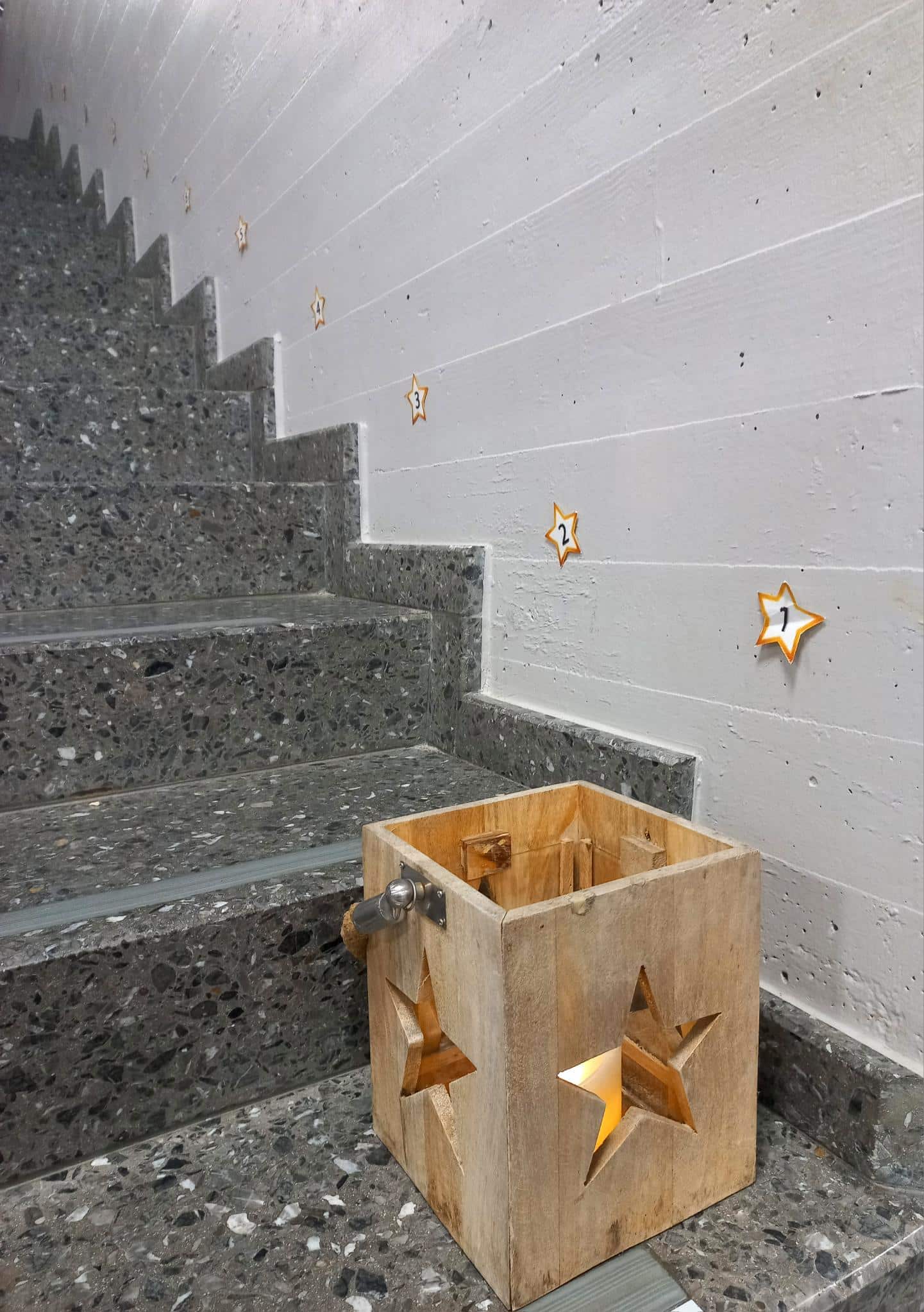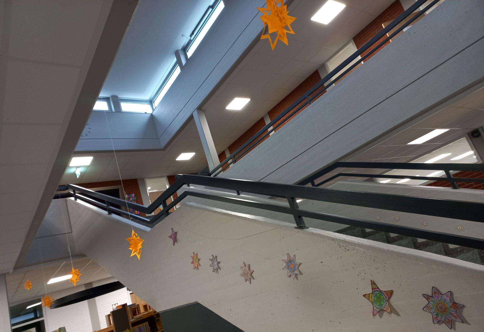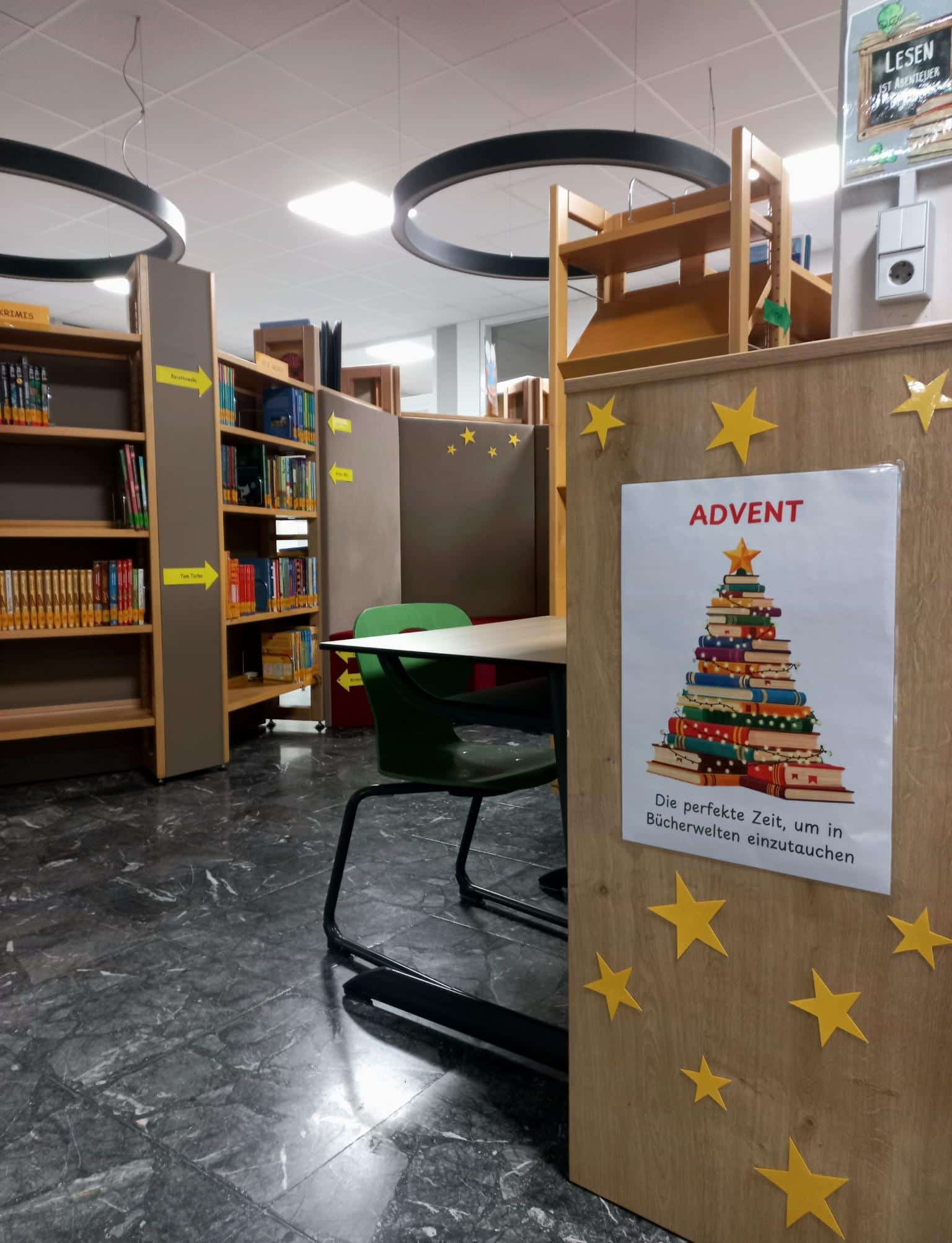 Im Schulhaus ist die Adventszeit eingezogen. Eine Laterne wandert jeden Tag eine Stufe höher, bis zur 24. Treppe. Die Bibliothek lädt ein in Weihnachts- und Winterwelten einzutauchen. Auch an der Dekoration im Schulhaus und den Adventkränzen erkennt man die Jahreszeit gut.